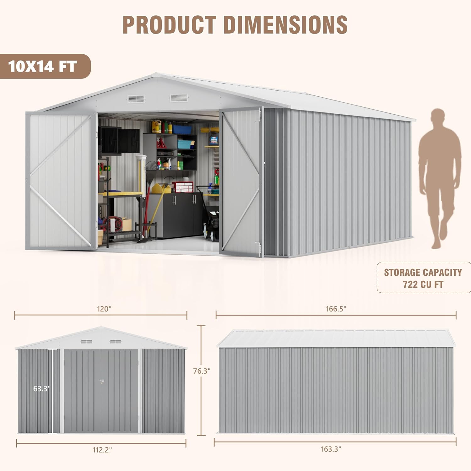Greesum 10×14 FT Outdoor Storage Shed, Metal Storaged Sheds Without Floor, Tool Sheds with Lockable Doors and Sloping Roof for Garden, Patio, Backyard, Gray