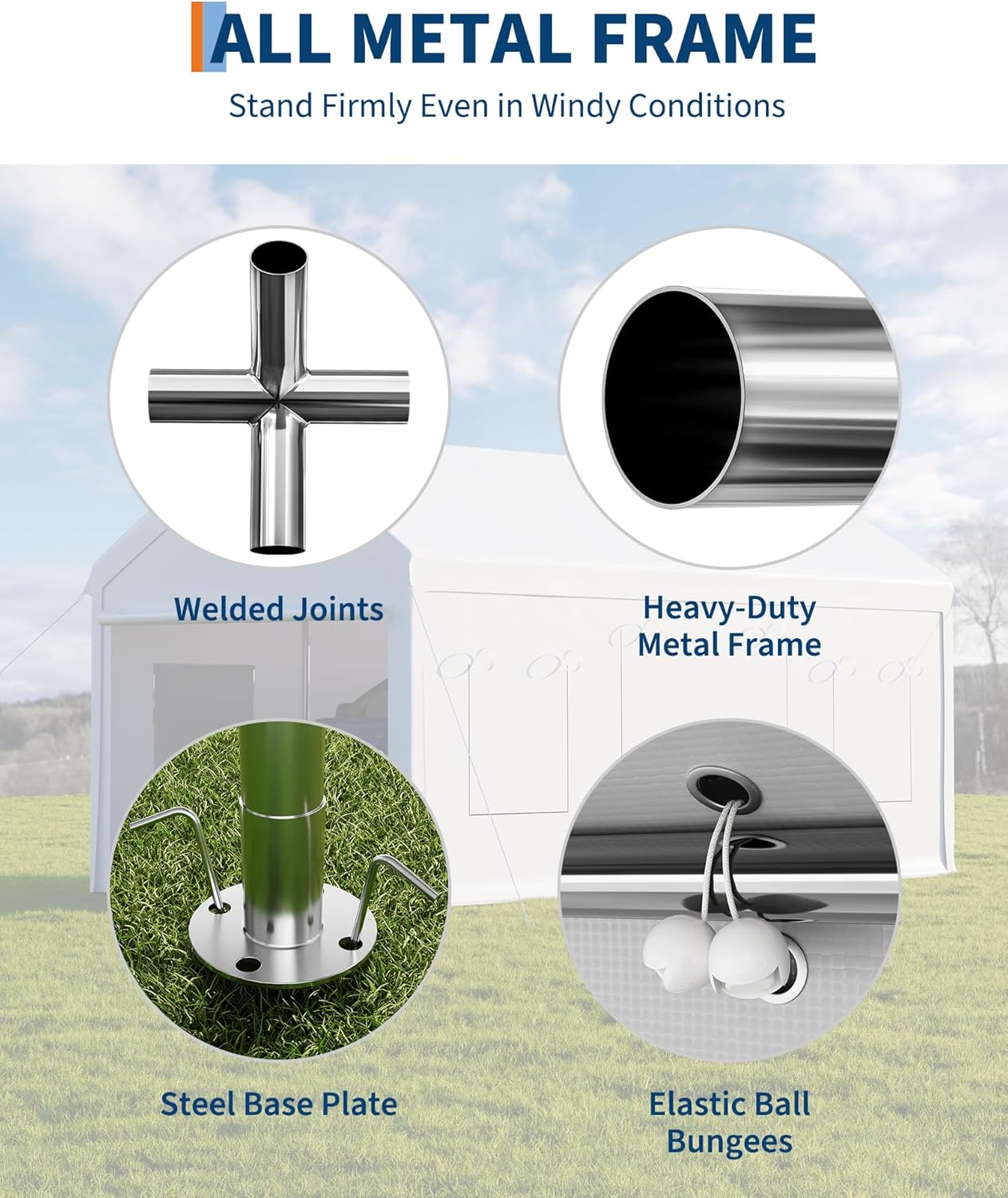 - HEAVY DUTY STEEL FRAME CONSTRUCTION: This carport is constructed of a durable, rust-resistant powder-coated steel frame that is specially engineered to withstand a wide range of weather conditions, preventing spalling, rust and corrosion. Solid 1.5-inch diameter, 1.2mm thick struts form 8 solid legs to ensure structural safety and stability, making it a sturdy and reliable carport option.