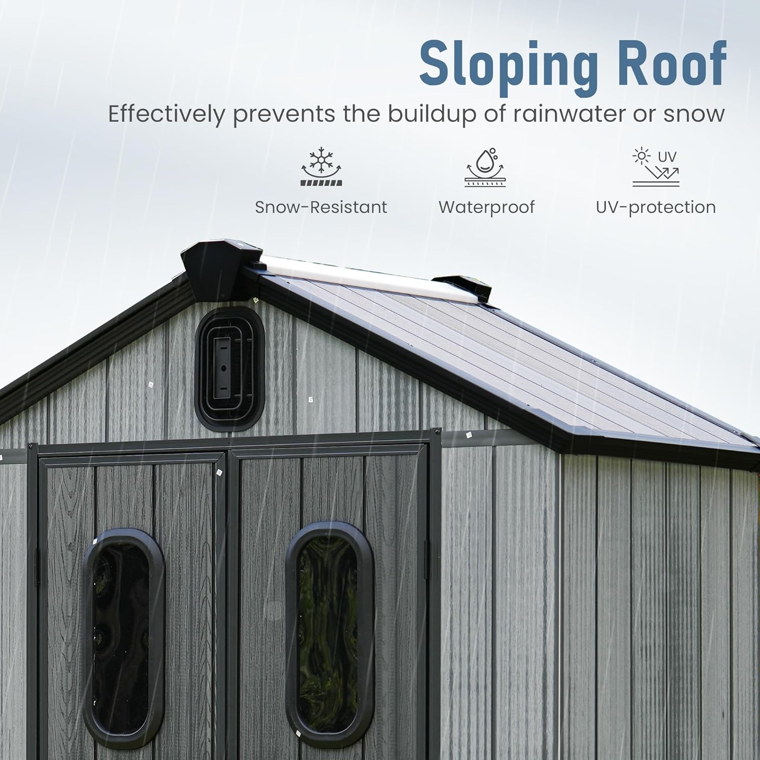 - Integrated Ventilation & Water Drainage: Features built-in air vents for improved airflow and an integrated rain gutter system that channels water away from the structure to help prevent leaks and interior moisture buildup.