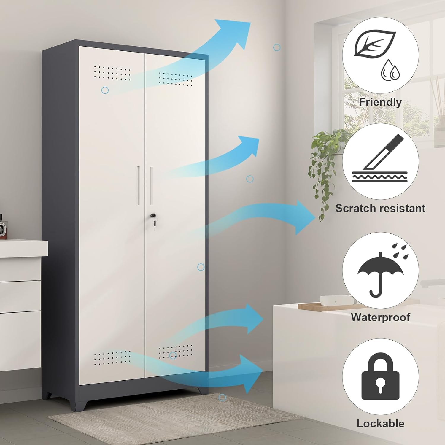 GREATMEET 72.8" H Metal Garage Storage Cabinets with Lock Door and Adjustable Shelves,Grey&White Broom Closet Storage Cabinet for Cleaning Supplies, Utility Closet for Garage, Bathroom,Kitchen,Home