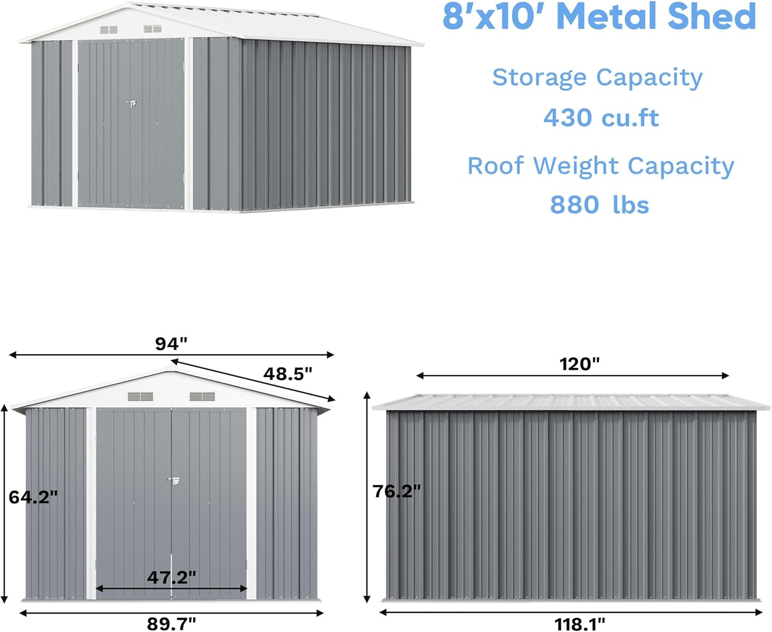 Greesum 8×10FT Outdoor Storage Shed, Metal Patio Storaged Sheds with Lockable Doors, Sheds & Outdoor Storage for Bike, Backyard, Pool and Garden, Gray