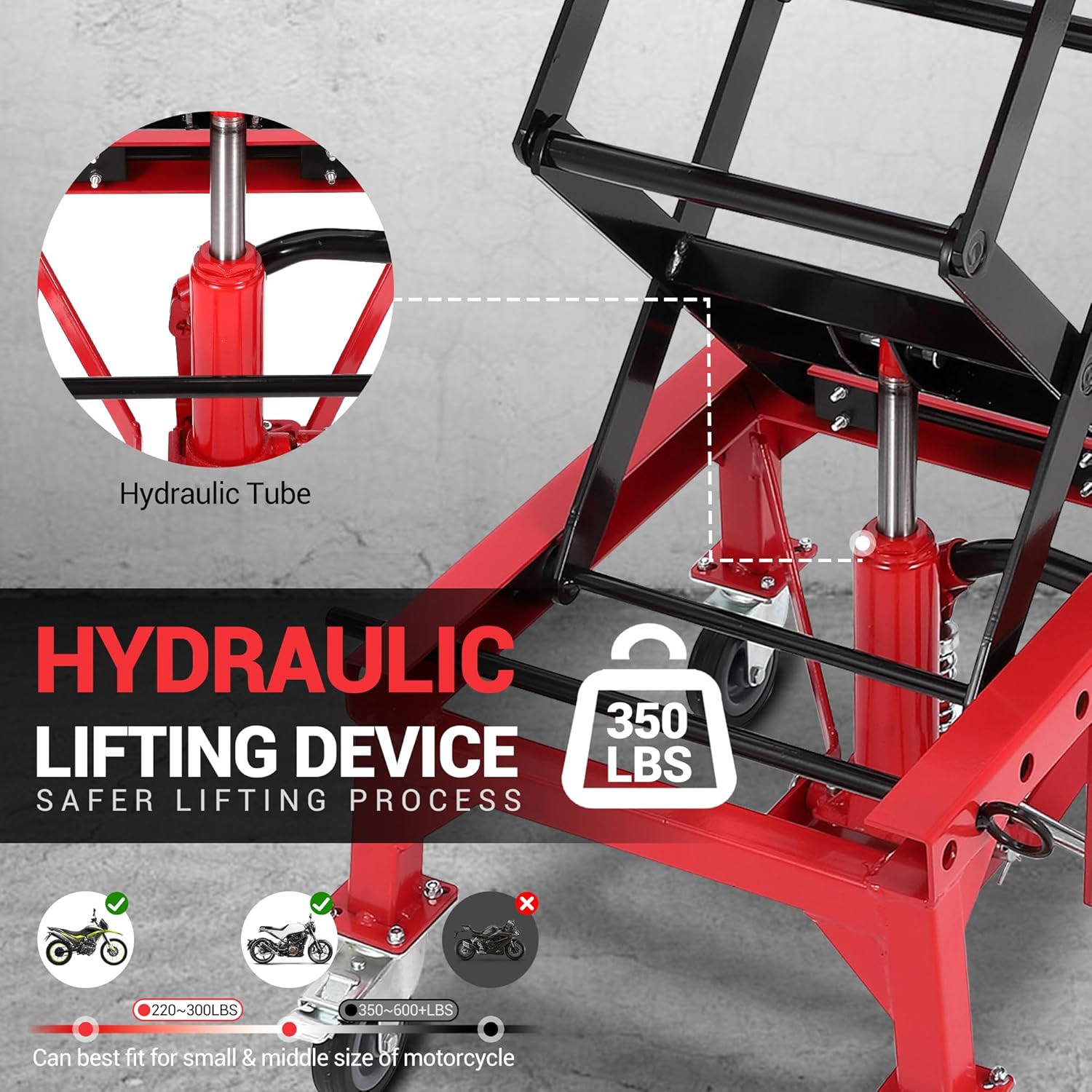 Hydraulic 350LBS Motorcycle Lift Jack - Foot-Pump Scissor Lift Table with Safety Lock, Wheels & Oil Drain Hole - Height Adjustable 13.78-34.25" for ATV, Dirt Bike, Cruiser Maintenance Red