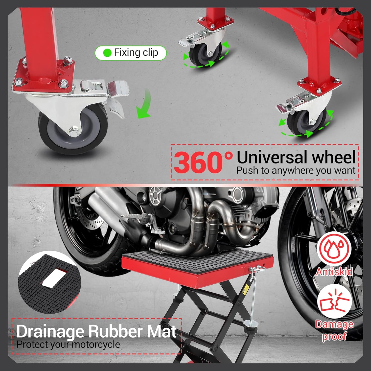 - Exceptional Safety with Heavy-Duty Construction ✔ 350 lbs Capacity & Solid Steel Frame: High-strength worm gear transmission and scissor structure ensure secure lifting for motorcycles, ATVs, and dirt bikes. ✔ Safety Pin & J-Hook: Prevents shaking or overturning during maintenance. Locking pole and bolt add double protection against accidental drops. ✔ Anti-Slip Rubber Pad: Striped veins on the top surface protect your vehicle from scratches and slippage.